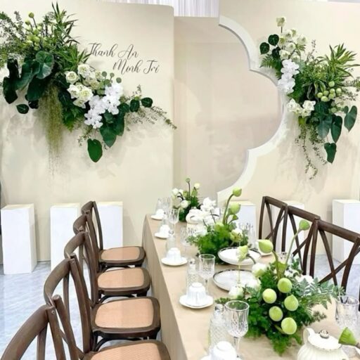 Bàn ghế sự kiện sang trọng: ghế banquet, Tiffany, bàn cocktail, bàn hội nghị phủ áo nơ tinh tế.
