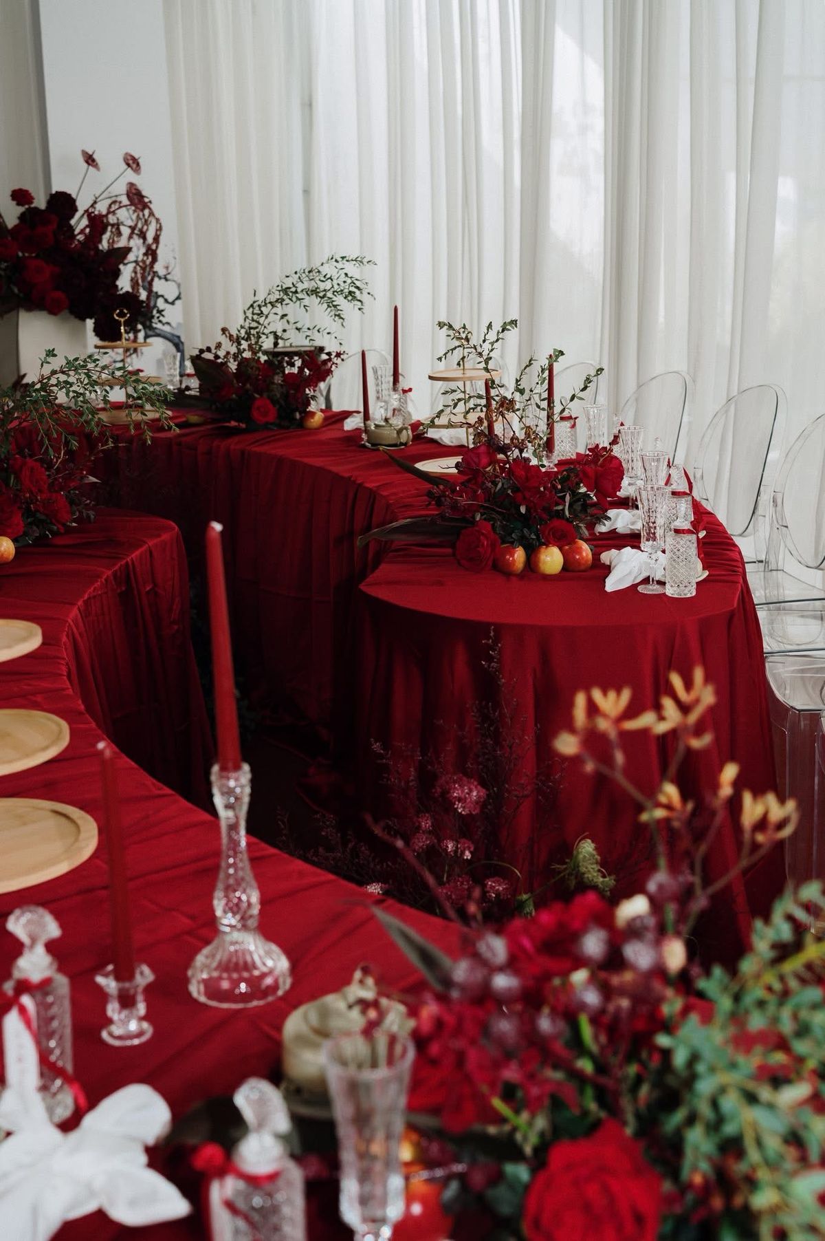 • Setup tinh tế: bàn tiệc phủ khăn cao cấp, trang trí hoa tươi, phụ kiện decor sang trọng.